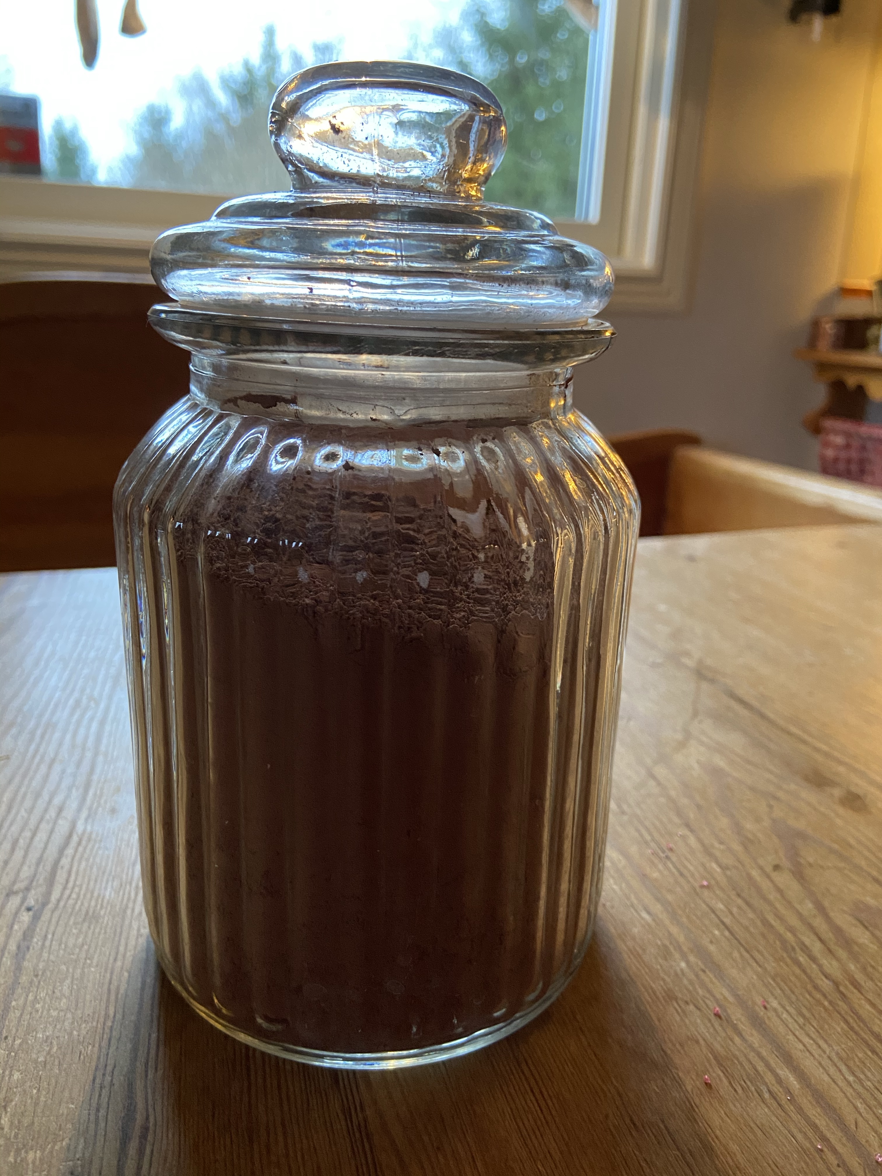 Jag älskar att testa att göra saker från grunden. Baka och göra smör mm mina barn är oftast inte jätteimponerade. De skulle helst köpa färdiga färgglada kakor med extra tillsatser osv men vissa saker har faktiskt fastnat hos dem. Framförallt chokladdryckspulver. Det är ju superenkelt och räcker länge. Framförallt vet man vad som är i. 180gr ekologisk kakao. 420gr Ekologiskt socker och ca 1tsk vaniljpulver el 1 vaniljstång. Mixa ordentligt i matberedaren och häll upp i burk som håller tätt. Eftersom det inte är några klumpförebyggande konstigheter kan det bli klumpar men jag vispar chokladen i kastrullen så blir det bra. Mina barn älskar den här chokladen.