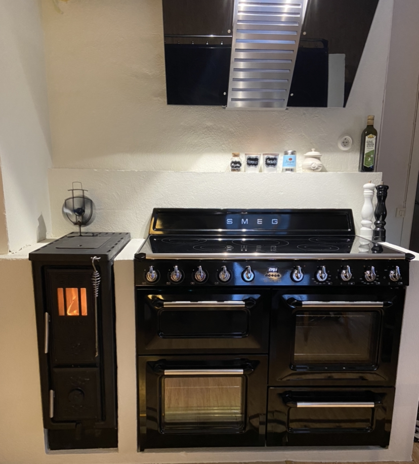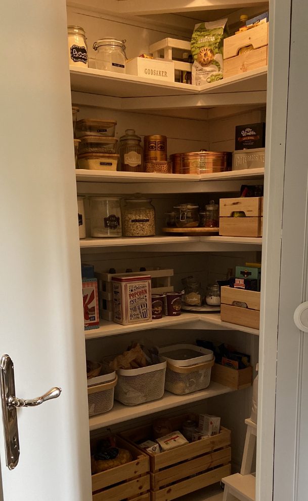 Både spis och vedspis är nytt sedan i våras. Vi skall lägga sten på de murade kanterna men visst är det så att lister och allt sådant gärna tar extra tid att få till? Vi är nästan säkra på att vi vill ha svart sten. Sedan exakt vilken sten och hur de exakta måtten blir.. det är det kluriga. Vad har vi gjort mer sedan sist jag skrev då? Jo skafferiet. Jag har så länge jag kan minnas velat ha ett gammaldags skafferi som man kan gå in i. Med ordning och reda och helst svalt så man kan förvara frukt och grönsaker där på höst/vinter. Det blev fantastiskt bra. Ev kommer vi öppna upp en ventil för att få in mer kyla men vi testar utan först för att se hur det går. Vi har tagit bort isolering mm just där för att få det svalare. Vi hittade platsen där det tidigare suttit en ytterdörr där inne med. sådant som är kul med gammalt hus. Öppnar man upp någonstans vet man aldrig vad man hittar. Vi hade i och för sig sett bilder på huset med dörr där så vi misstänkte att det fanns en där bakom. Visst blev det bra? Skall försöka få till en bättre bild även utifrån vid tillfälle. Ett mål är att ha alla torrvaror i någon form av glasburk.Dels fför att det är fint men också för att inte locka in möss. Japp såpass på landet bor vi att det är ett verkligt ”hot”. Dessutom hjälper det ju till att motverka att andra kryp sprider sig mellan förpackningar.