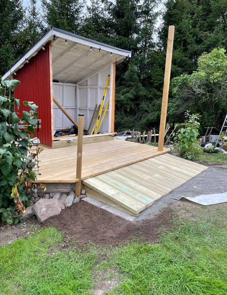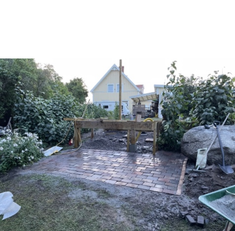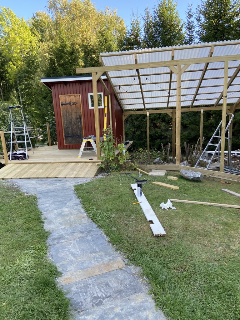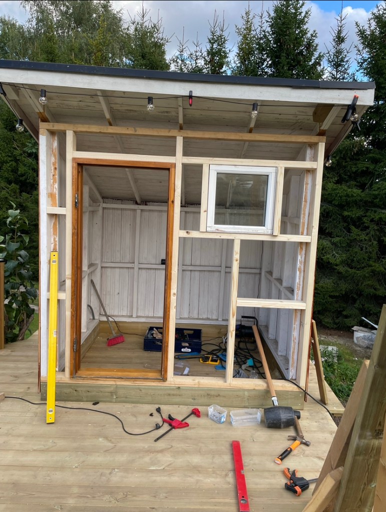 Nej men bygget är ju tänkt att bli hönshus till våra tre damer som skall flytta in där så snart det blir helt klart. Det bor just nu i en tillfällig sommarbostad. Den skall snart få flytta in i utegården på bilden då det skall byggas solceller på vårt hustak och då måste hönorna som bor längs väggen flytta på sig.